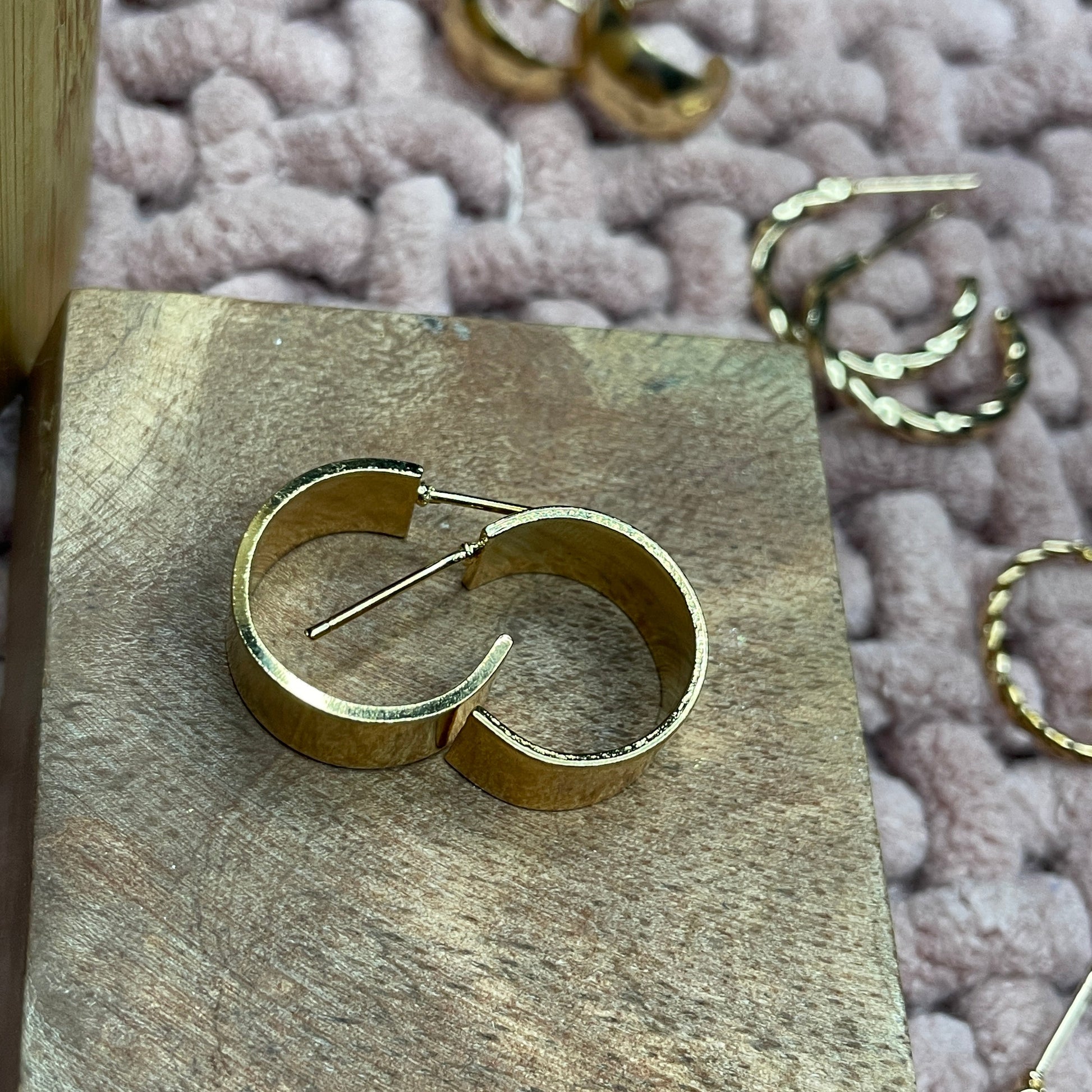These timeless gold-toned hoops feature a clean, polished finish with subtle textural detailing along the edges that adds refined dimension. The perfect everyday essential with a sleek, streamlined silhouette that effortlessly complements any style from casual to elegant.
