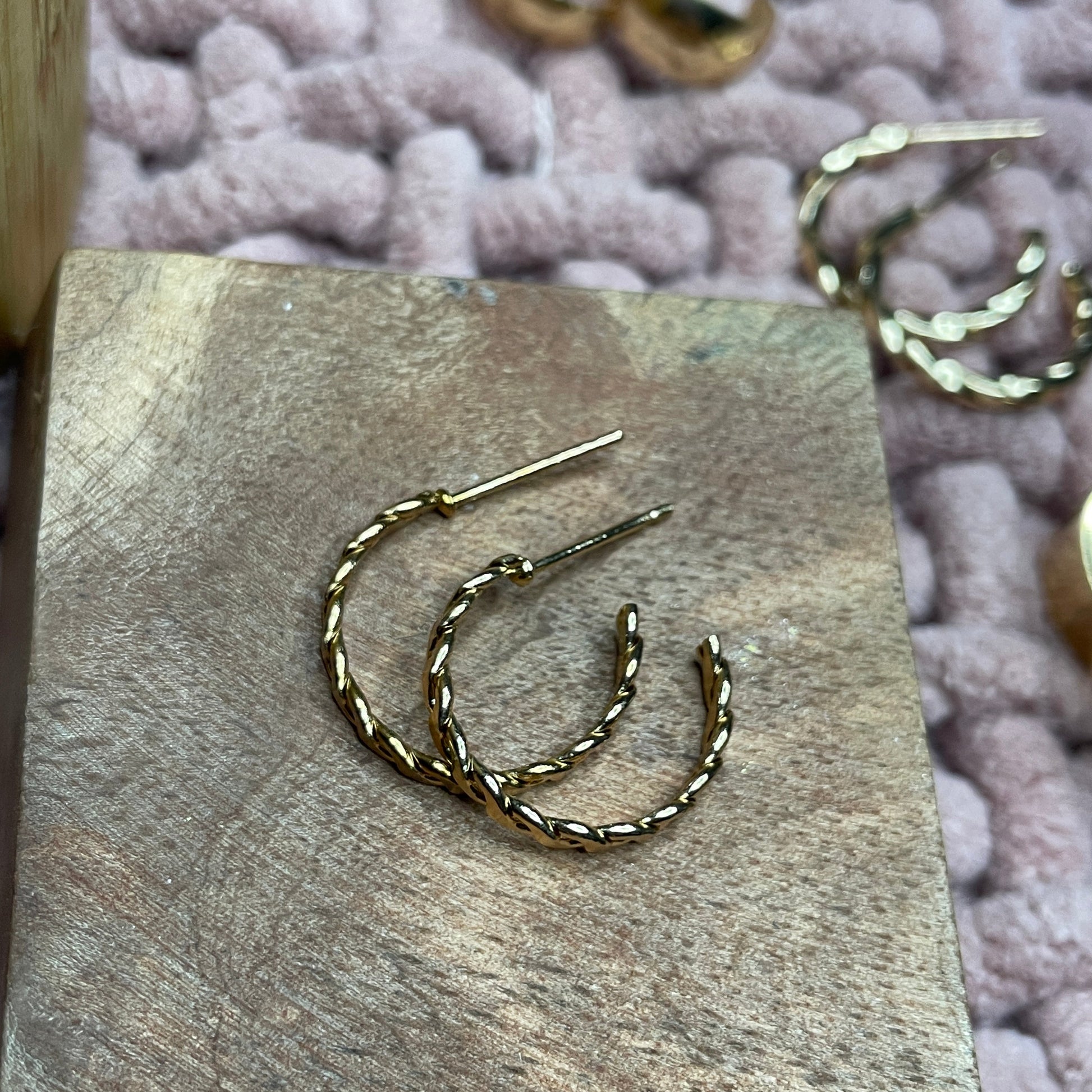 These striking gold-toned hoops feature an intricate twisted rope design that spirals elegantly around the entire circumference. The textured surface creates beautiful light play and movement, offering a sophisticated twist on the classic hoop silhouette.