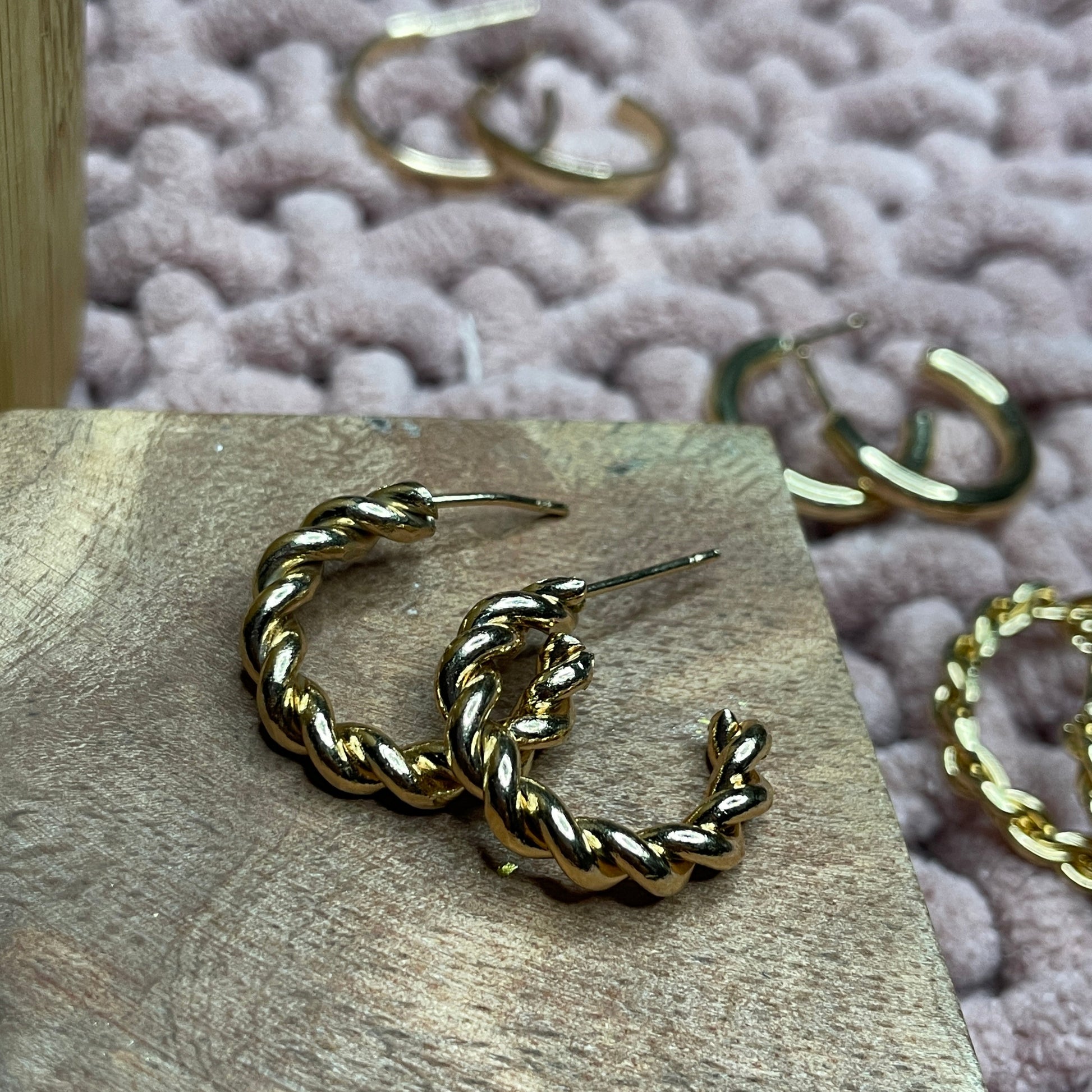 Medium-sized gold-tone hoops with a twisted rope design that adds dynamic texture and soft shine. Versatile for both casual and dressy looks.